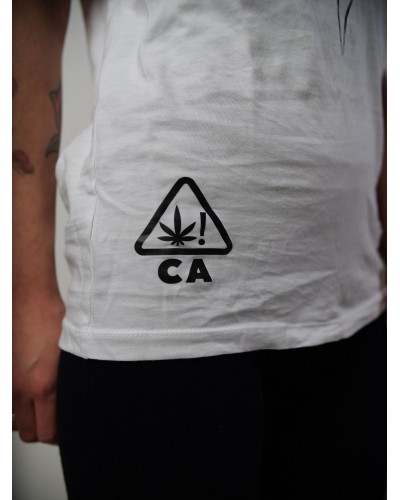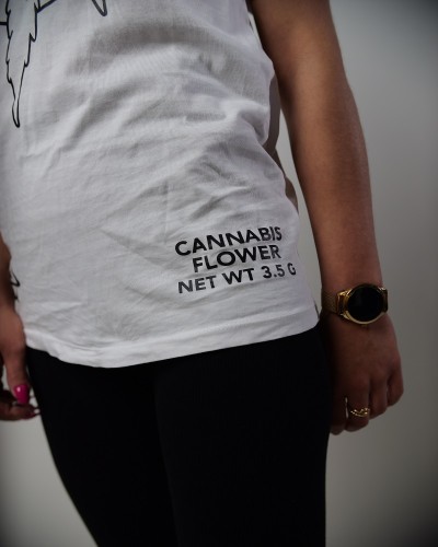 Damski biały t-shirt z przodu ma nadruk przedstawiający dymiący liść marihuany i napis Lawa Hemp. Dodatkowo, na bokach znajdziesz dwa małe nadruki nawiązujące do uprawy marihuany.