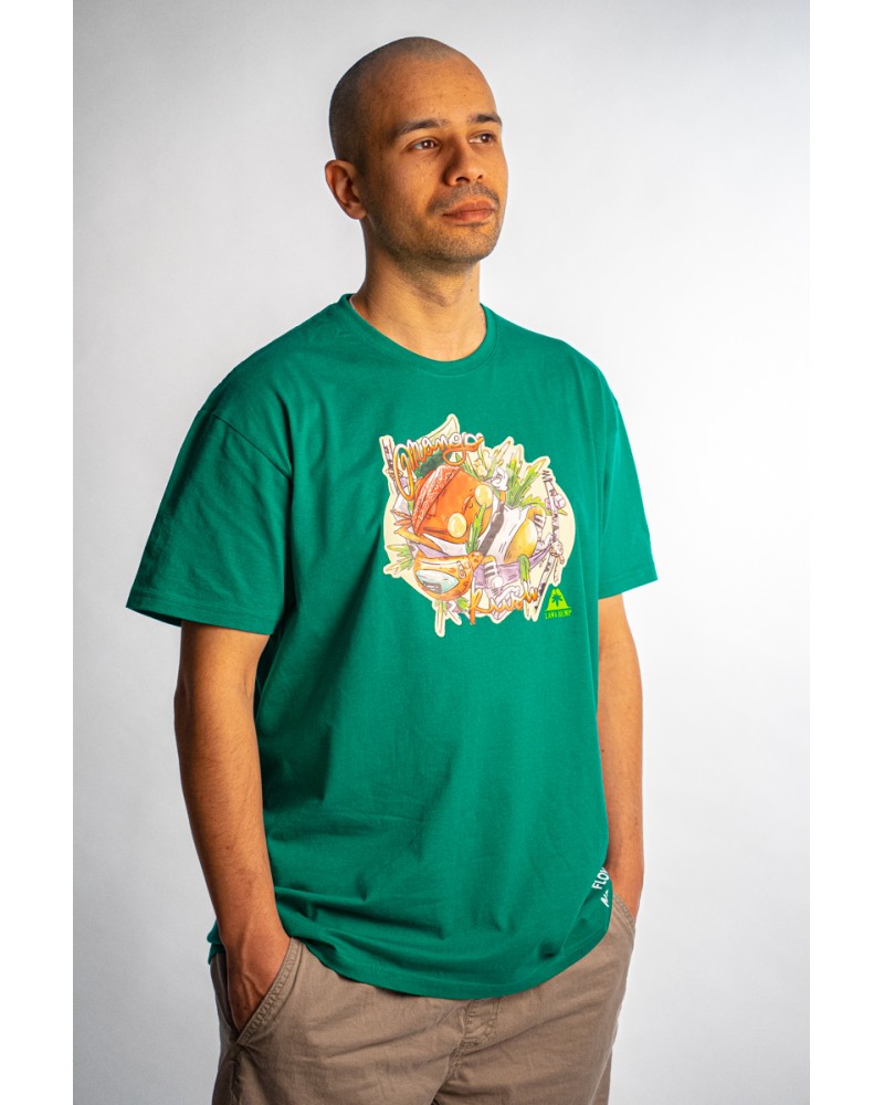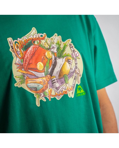 Zielony t-shirt z upalonym nadrukiem. Zobaczysz na nim chillujące na hamaku mango, które delektuje się spokojem i skrętem. Stan idealny. Koszulka też? bo wykonana z wysokogatunkowej bawełny, co sprawia, że nosi się ją miło, lekko i wygodnie.