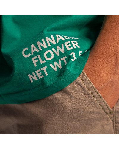 Zielona koszulka ma też dodatkowe dwa nadruku. Znajdziesz je na dole po bokach. Nawiązują one do upraw marihuany.