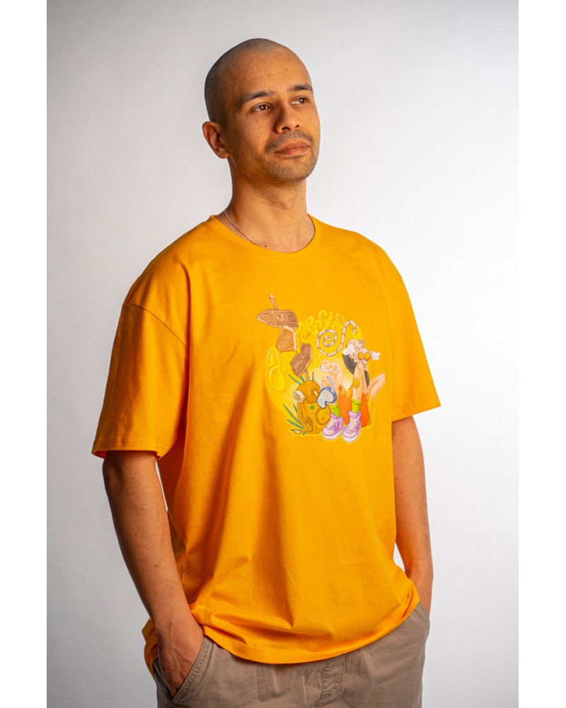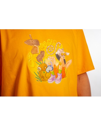 Pomarańczowy t-shirt ma nadrukowanego chillującego gościa. Leży on sobie na rozstaju dróg i delektuje się gęstym dymem Amnesii. Nie jest sam - towarzystwa utrzymuje mu upalony zwierz.