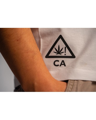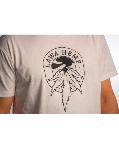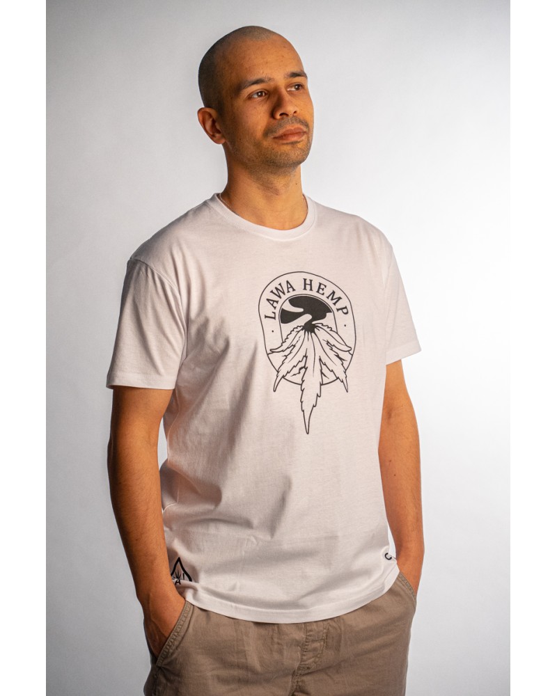 Biały t-shirt z przodu ma nadruk przedstawiający dymiący liść marihuany i napis Lawa Hemp. Dodatkowo, na bokach znajdziesz dwa małe nadruki nawiązujące do uprawy marihuany.