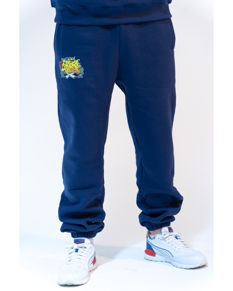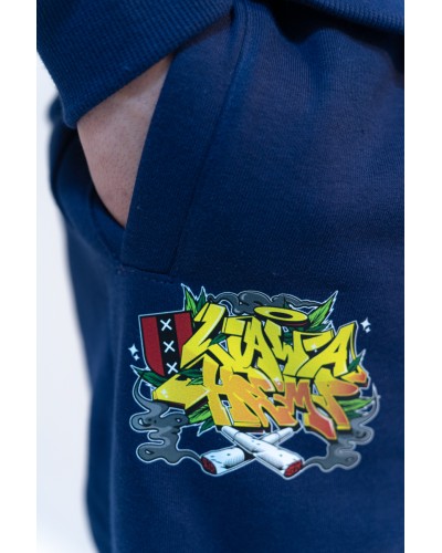 Granatowe spodnie dresowe, które wyróżniają się przede wszystkim jakością wykonania, niesamowicie przyjemnym materiałem, a także nadrukami dedykowanymi fanom marihuany.