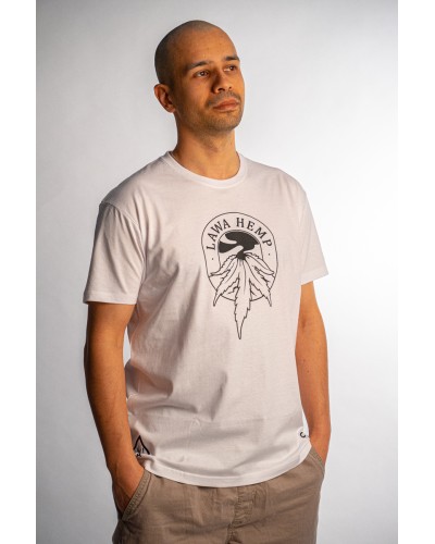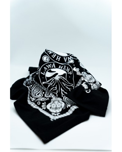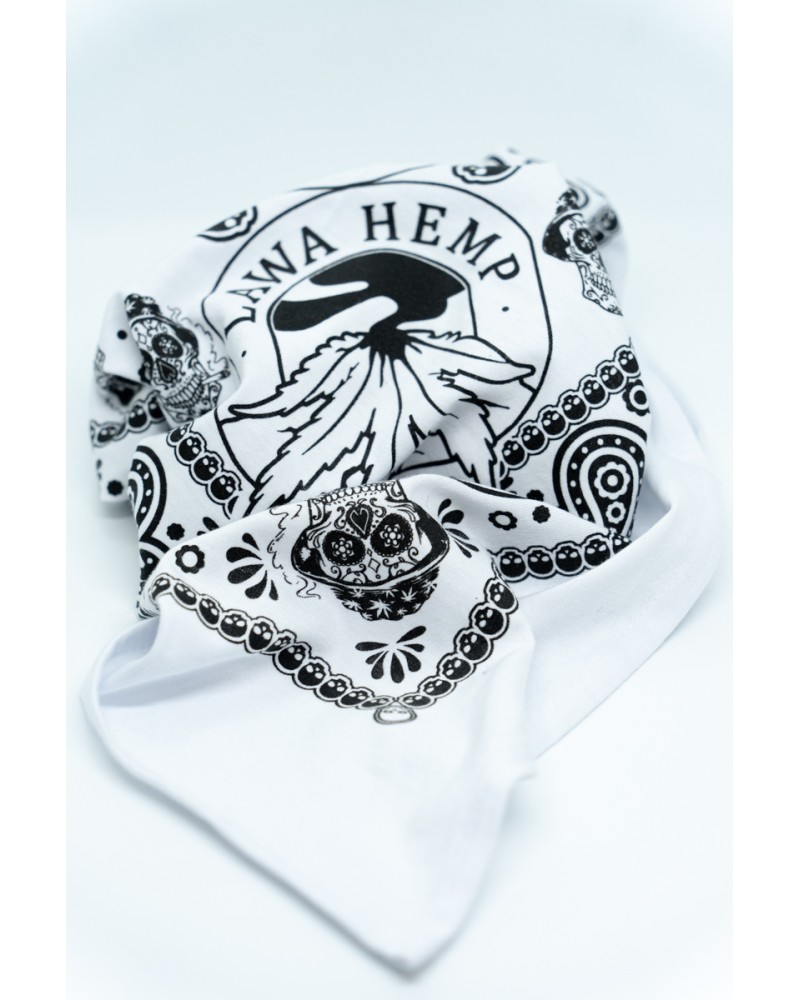 Czaszki. Czaszki palące jointy. Dymiące liście marihuany. Napis Lawa Hemp. I jeszcze kilka graficznych dodatków. Wypisz, wymaluj biała bandana dla fana jarania.